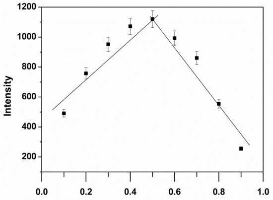 Stoichiometry for P and Cu2+ by Job’s plot in alcohol–aqueous media (v/v, 8:2, pH 6.3, 0.02 M HEPES). The total concentration of ([P] + [Cu2+]) was 10 μM.