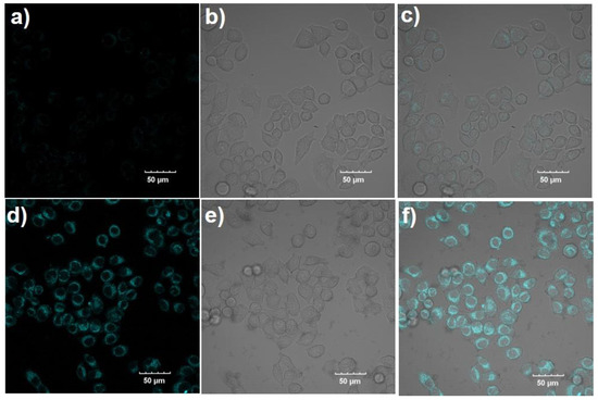 Hela cells fluorescence images. (a) cells cultured with 10 µM of P for 30 min in the growth medium; (b) image of bright field cells in panel (a); (c) images of overlay in panels (a,b); (d) after supplementing with 1 µM of Cu2+ for 30 min, Hl-7701 cells incubated with P (10 µM) for additional 30 min; (e) image of bright field cells in panel (d); (f) images of overlay in panels (d,e).