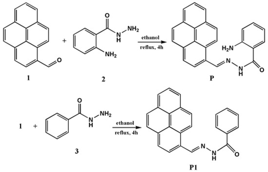 With this in mind, in this study, probe P was reasonably constructed by connecting an important fluorophore pyrene with 2-aminobenzhydrazide via –C=N– bond (Scheme 1). The responses of P toward Cu2+ were explored in detail by UV and fluorescence analysis. P was also demonstrated that it could react with Cu2+ and effectively turn on fluorescence in living cells. The design concept was explained as follows: (1) Pyrene was used as the fluorophore in view of its excellent photophysical properties and easy modification on the molecular structure [25,26]. In particular, its fine structures of excited state were the ideal signal units for construction of ratio-type fluorescent probes, which measure the ratio of fluorescence intensity at two different wavelengths as a signal parameter. This mode is not affected by the intensity of light source and instrument; (2) Acylhydrazone Schiff base was one of most selective π-conjugated reagents for Cu2+. In addition, this type of compound was characterized by ketone–enol tautomerism, and O atom of the carbonyl group (–C=O), N atom of the amino group (–NH2), and the imine group (–N=CH) could participate in coordination with Cu2+ and consequently produced stable coordination complexes according to HSAB principle [27]; (3) C=N isomerization and photoinduced electron-transfer (PET) phenomenon were introduced as common signaling mechanisms to play roles in photophysical processes upon binding of P with Cu2+, which was based on the following considerations. Firstly, the main advantage was that it was easy to prepare and design “off-on” probes based on the two mechanisms; furthermore, the affinity of the chelating group C=N for heavy metal ions was stronger than that for alkali metals and alkaline earth metals [28,29].