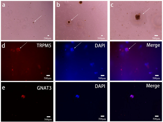 The cultured taste organoids were fixed with 4% (w/v) paraformaldehyde at room temperature for 30 min, permeabilized with 0.1% (v/v) Triton X-100 for 20 min, and finally blocked with 5% (w/v) bovine serum albumin (BSA) solution for 1 h. Then, they were incubated at 37 °C for 2 h with a primary antibody (GNAT3 Rabbit pAb, ABclonal, A15982, Wuhan, China; TRPM5 rabbit polyclonal antibody, Proteintech, 18027-1-AP, Chicago, MA, USA) and then with secondary antibody (Goat Anti-Rabbit IgG labeled with Flour594, Affinity, S0008, Jiangsu, China) for 1 h, and finally with 4’,6-diamidino-2-phenylindole (DAPI) for 20 min. Stained taste bud organoids were applied on glass slides and observed by a fluorescence microscope using a CARL ZEISS, AXIO Scope. A1 microscope (Carl Zeiss, Axio Scope A1, Germany).