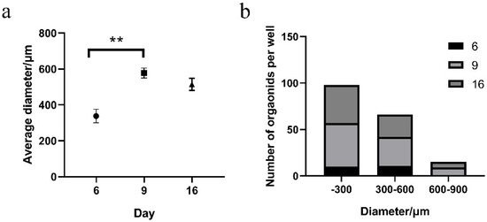 Particle size statistics of taste bud organoids at different growth days. (a) The average diameter of taste bud organoids on the 6th, 9th, and 16th day. All data represent the mean ± standard error of the mean (S.E.M.) and are shown in a histogram. ** p < 0.01 is considered as significant difference, Student’s t-test. (b) Different particle size distributions of taste bud organoids at different growth days.