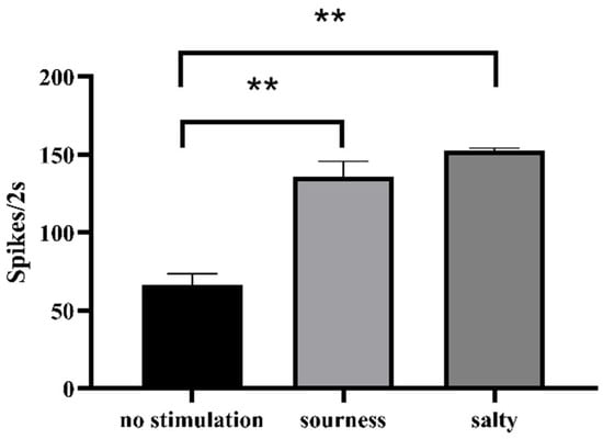 Spike responses of taste bud organoids are stimulated by different taste substances. All data represent the mean ± standard error of the mean (S.E.M.) and are shown in a histogram. ** p < 0.01 is considered as significant difference, Student’s t-test.
