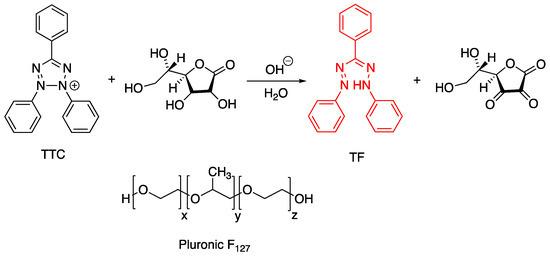 Chemical structures of 2,3,5-triphenyl-2H-tetrazolium (TTC), triphenyl formazan (TF) and Pluronic F127.