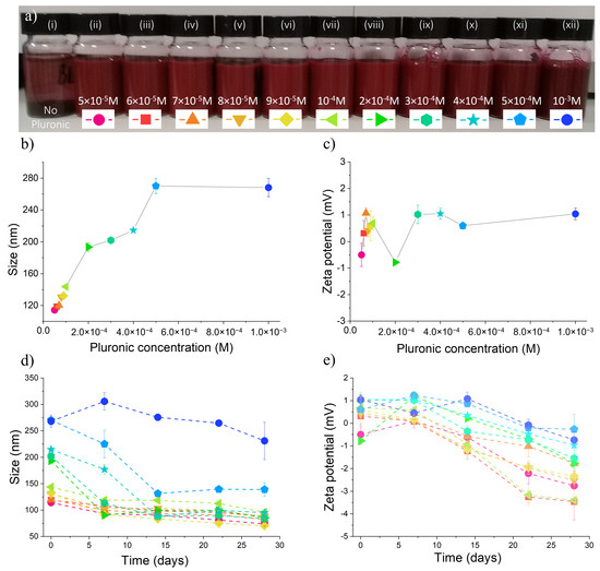 The colloids were stable for 28 days, but with a trend of decreasing size and a slight shift in zeta potential toward negative values (Figure 3d,e). Due to the nonionic nature of Pluronic and the low zeta potential value (that usually leads to aggregation), the great stability of the colloids could be explained by the steric hindrance of the polymer (thermodynamic stabilisation).
