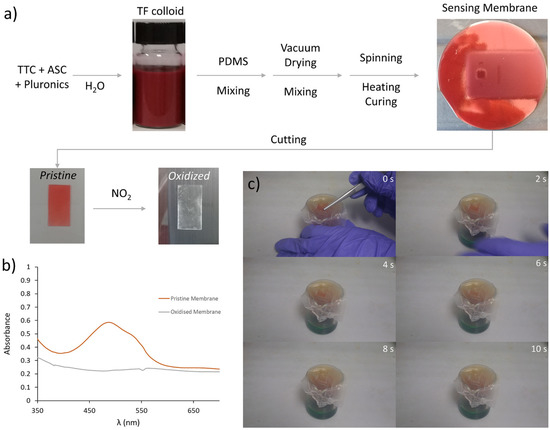 In conclusion, we reported the design and the preparation of a new PDMS sensing membrane able to detect NO2 gas via an optical output. The sensing system was based on a redox-active organic colloid prepared via a simple, cheap, and green method, using as starting materials the redox-active TTC and the amphiphilic Pluronic F-127. The reduction of TTC with ASC at basic pH produced TF colloids stabilised by the amphiphilic polymer displaying hydrodynamic diameters ranging from 114 to 305 nm, reasonably low size polydispersity, and zeta potential close to zero mV. The colloids demonstrated stability for 28 days with a tendency to decrease in size. The TF/Pluronic colloids were homogeneously dispersed in the PDMS matrix, which was then cured at 120 °C without affecting the stability of the chromogenic TF red dye. The derived, red-coloured membranes were eventually integrated into a low-cost device, which was able to selectively sense NO2 gas due to the fast TF → TTC conversion, demonstrating a bleaching process in the range of seconds and with a sensitivity of 8 × 10−6 ppm−1 s−1 NO2, and a detection limit of 5 ppm for a 10 min sampling. These elastomeric membranes are envisioned to be used for the fabrication of chromogenic and light-flexible sensor devices for the detection of toxic oxidising agents and personal exposure assessment. In this sense, the easy fabrication in terms of colloids preparation, membrane and device fabrication allow tailoring the sensing properties of the systems as desired, and further improvements could be designed to minimise the detection time and sensitivity.