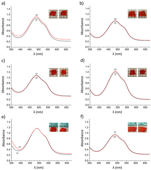 To fabricate the coloured sensing membranes, colloids containing 0.1 M of TF and a Pluronic concentration of 10−4 M were selected, since they showed suitable colloidal size in the submicron region, stability, and the amount of Pluronic did not affect the crosslinking of the PDMS matrix. PDMS was cured at 120 °C overnight, thus providing a homogenous transparent red-coloured membrane (see Figure 5, and Section 2.3 for fabrication details). Because PDMS is highly permeable to gases, the membrane was then utilised for the optical detection of high-oxidant gases such as NO2.