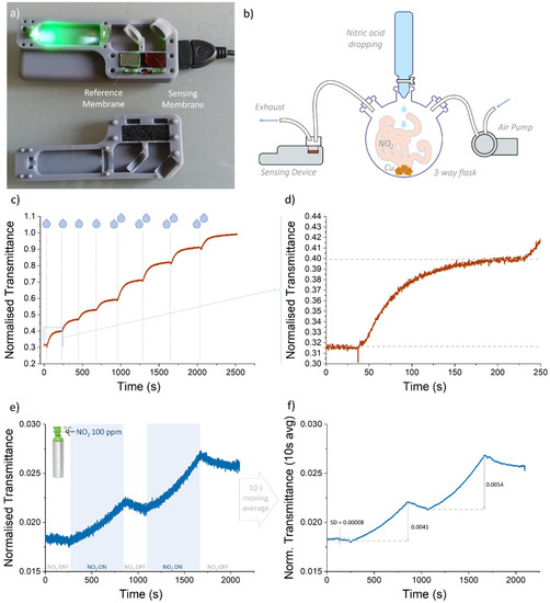 Since the membrane showed high selectivity towards NO2 gas, the sensing system was studied systematically to evaluate the sensitivity and the detection limit. More precisely, the experiments were repeated in a more controlled way, i.e., by slowly dropping nitric acid solution onto metallic copper to produce a precise amount of NO2 within a 50 mL three-way flask, and pumping at 10 mL/s towards the sensor device (Figure 7b). The signals were recorded continuously, and the acid dropping made it possible to continue until the signal reached a plateau. The measurement was stopped at complete oxidation of the membrane, and the normalised transmittance finally calculated (Figure 7c,d).