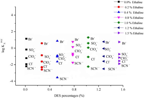 The ion selectivity of the fabricated microelectrode will respond to DES quantities because the deep eutectic solvent acts as an ion exchanger. It should consider the influence of the selectivity coefficient values. To interpret this effect, the selectivity coefficient values of the constructed Ag/AgCl microelectrode in the presence of the different amounts of DES for various anions were determined. The obtained values of the ion selectivity coefficient are plotted in Figure 2. Interestingly, the results showed that the ion selectivity coefficient values of the constructed microelectrode showed very small changes in the presence of different amounts of DES. This indicated that DES was a very good ion exchanger in the polymer membrane and controlled the ion selectivity values. In this way, ethaline maintained the ionic constraint of the constructed microelectrode. Indeed, this observation was very important, and for the first time confirmed that almost no studied DESs interacted with the ion of choice and were consequently appropriate for customising as ion-exchange membranes.