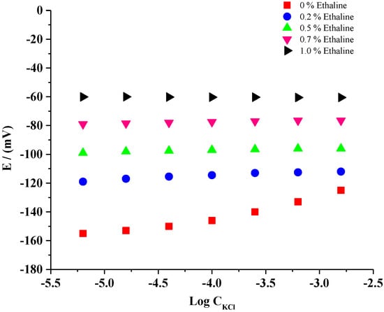 The stability of the Cl− ion concentration is the main limitation of the conventional reference electrode [20]. The potential stability of the fabricated Ag/AgCl microelectrode was tested against Cl− ions for both ionic liquid-free and ionic liquid-containing systems. Figure 3 represents the potential stability profile of the fabricated reference microelectrode (Ag/AgCl) in the presence and absence of different amounts of DES (0–1.5%) in 20 mM Na2SO4 solution containing different concentrations of KCl (10−5 to 10−2 M). The results indicated that the potential stability of the Ag/AgCl reference electrode was influenced by Cl− ions in the absence of DES. When increasing the concentration of Cl− ions, a cationic response was observed (Figure 3), indicating that the obtained potential of the reference electrode was not constant. The DES additive to the membrane of the fabricated reference microelectrode assessed good results in the Cl− ion concentration owing to the constant stability potential. Optimum stability was observed in the presence of 1.0% ethaline. For this system, the change in potential was about ±0.25 mV.
