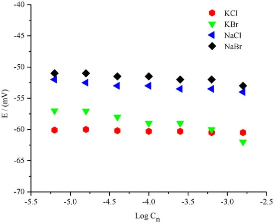 Results showed that the fabricated Ag/AgCl microelectrode was insensitive to different concentrations of Cl− ions owing to the presence of DESs. This finding supported our assumption that the ionic activity of ethaline acts as an ion exchanger in the polymer membrane, playing a very important role in maintaining the Cl− ion concentration in the fabricated microelectrode. The next step was to check whether either Cl− or Br− ions affected the potential stability of the constructed microelectrode with different salts. This would strengthen our hypothesis. The interference of Cl− and Br− ions of different salts in the potential stability of the DES-based fabricated reference electrode was also studied [22]. Figure 4 shows the potential dependency of the microelectrode on a range of concentrations of different anions (Cl− and Br−) obtained from different salts. The results showed a higher than −9 mV ± 0.31 potential increase in the electrode for Br− anions, while better stability was exhibited against Cl− anions. The change in the potential for the electrode in the presence of 1.0% ethaline displayed the least drift in NaCl (±0.19 mV) for the Cl− anion, whereas the greatest change in KBr (±1.77) over continuous measurement was for the Br− anion. This behaviour was not surprising owing to previous studies [16].