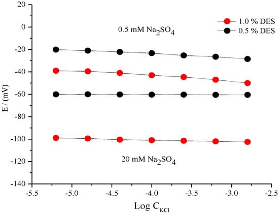 The concentration of the supporting electrolyte may also influence the sensitivity and stability of the fabricated micro-reference electrode. Another factor for the supporting electrolyte was the potential stability of the fabricated microelectrode in the presence of both the diluted electrolyte (0.5 mM Na2SO4) and concentrated electrolyte solutions (20 mM Na2SO4). The data in Figure 5 show the effect of 0.5 and 1.0% DES contents. Comparatively, the microelectrode that contained 1.0% DES possessed better stability against Cl− ions for both the diluted and concentrated electrolyte systems. For the diluted Na2SO4 (0.5 mM) solution the potential reference electrode was not constant under the studied concentration of Cl− ion, which indicated that the reference electrode did not show potential stability against the studied range of Cl− ions in the presence of a diluted supporting electrolyte. The amounts of the supporting electrolytes should be considered an important aspect of the stability of the fabricated reference electrode. In our experiment, they gave a good range of potential stability, particularly at low concentrations such as 20 mM, as shown in Figure 5.