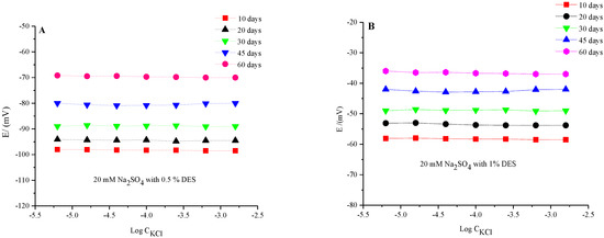 Regarding the time stability for the fabricated membrane, Figure 6 shows the observation stabilities for the potentiometric signal. The potential of the fabricated membrane-based Ag/AgCl electrode was examined in two cases: one in the presence of 0.5% DES and the other one in 1.0% DES under various concentrations of Cl− ions for 10 to 60 days. There were many uncertain results in the potentiometric signal due to the large resistance in the electrochemical cell, as seen in Figure 5. A reasonable observed potential consequence justified the influence of DES additives on the performance of the electrode. We assessed that the stability of the EMF response of the same microelectrode system was in good agreement with the concentrated electrolyte solution, i.e., 20 mM Na2SO4, which was previously reported [21].