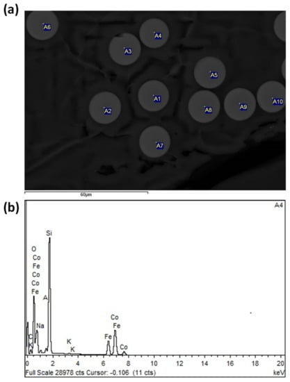The morphological characterization of Co2FeSi G-CMMWs was performed using the scanning electron microscopy technique (SEM). Figure 1a shows the perfect cylindrical cross section and homogeneous elements distribution of the Co2FeSi G-CMMWs. To confirm the nominal composition of Co50Fe25Si25 G-CMMWs, an analysis of the chemical composition of the metallic nucleus was performed using EDX, as shown in Figure 1b. From the EDX data obtained from Figure 1b the composition of the metallic nucleus was observed to be slightly different from the stoichiometric one (Co2FeSi). This small difference was related to the peculiarities of the preparation method involving alloy melting and casting. To estimate the amount of difference we checked the nominal composition for 10 points as illustrated in Figure 1a. For all points a 2:1 ratio was confirmed for Co and Fe, respectively, with an atomic average Co45Fe22Si33. A high ratio of Si was observed, due to the interfacial layer between the glass coating and the metallic nucleus. The origin of such an interfacial layer was related to the peculiarities of the preparation method involving alloy melting inside the glass tube and subsequent casting. As previously reported [], typically the thickness of such an interfacial layer is about 0.5 µm. Accordingly, for the present case (d ≈ 4 µm) the contribution of such an interfacial layer reflected in elevated Si-content might be relevant. Thus, this explains the high signal of Si that appeared on the EDX spectra (see Figure 1b).