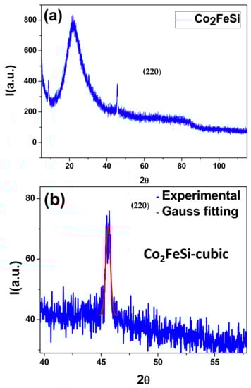 The XRD and its analysis matched with our previous studies of similar alloys, together with the chemical composition of the studied sample; which indicated the presence of the cubic Co2FeSi phase [,]. According to theoretical calculations obtained from the materialsproyect.org [], the signal (220) peak represented a highly ordered L21 cubic structure (space group: Fm-3m). The lattice parameter of Co2FeSi was found to be 5.640 Å, which is in agreement with similar compositions [,].