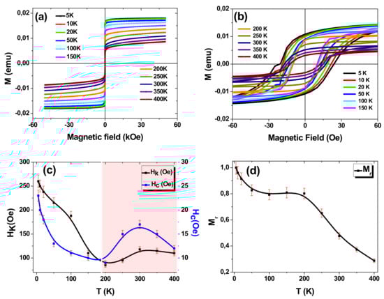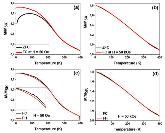 To check the possible magnetic phase transition with changes of temperature, the FC and FH curves were measured at low and high magnetic field. As described in Figure 4c, the FC and FH curves with applied low magnetic field (H = 50 Oe) were perfectly matching in the temperature range from 400 to 190 K, which indicated a perfectly stable ferromagnetic state in this range of T. Below T = 190 K a small spacing between FC and FH was detected and FC ascended the FH curves then matched again at T = 15 K. This behavior is due to a magnetic phase transition, as described and reported elsewhere [,,,,]. Such behavior was not observed when the FC and FH were measured at high magnetic fields, as illustrated in Figure 4d. It is noteworthy, that the changing of magnetic behavior of Hc and Mr occurred for the temperature below 200 K i.e., below TB. Thus, the behavior of Hc and Mr was strongly related to the changing of the magnetic phase transition where a different magnetic response was found.