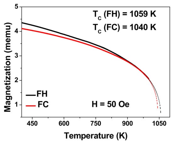 As shown in Figure 5, FC and FH magnetization curves showed the ordinary ferromagnetic behavior—magnetization decreased with increase of temperature. FC and FH magnetic curves showed different behavior for the temperature range from 400 to 900 K. Above T = 900 K the two magnetic curves were perfectly matching. Below the blocking temperature a magnetic phase transition was found. Unfortunately, we were not able to observe the TC of Co2FeSi G-CMMWs, as it is expected to be more than 1100 K for the bulk alloy. Therefore, a fitting of FC and FH magnetic curves was performed by using the following equation () and the estimation of TC = 1040 K and 1059 K for FC and FH magnetic curves, respectively, and it corresponded well with the value from the literature []. The differences in the TC values must be related to different magnetic phases where the magnetic responses are different.