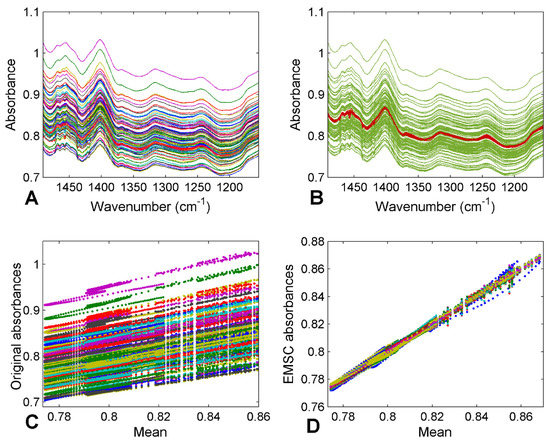 FTIR spectra of plasma samples before (A) and after (B) EMSC pre-treatment, and the corresponding plots of scattering effects between signals before (C) and after (D) correction.
