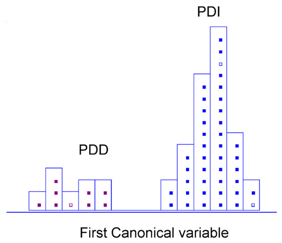 After the differentiation among three classes of patients was obtained, we carried out a sub-analysis, comparing the group of patients affected by Parkinson’s disease depending on the disease’s progress. Therefore, a single undifferentiated group of Parkinson’s was split up into two distinct classes: PD at an early stage and PD-related dementia. The classification strategy followed the same classification rules as described ahead [52]. However, in compliance with rules cited before, the number of discriminant variables changed so that training objects were at least three times greater than the number of final selected wavenumbers. Full CV and a test subset of three samples, selected randomly as two for the PDI group and one for PDD, were performed to optimise and validate classifications, always on autoscaled data. In this case, 100% in classification and 100% in prediction (internal and external) were achieved (Table 3). Herein, the number of features was reduced from 340 to only 15 variables, which makes our approach even more remarkable (Table 4). A discriminative histogram is reported in Figure 4, which shows a clear class separation on the first canonical variable. Thus, the first canonical variable represents the direction with the maximum discrimination power, namely the maximum Fisher ratio (the ratio between the interclass and the intraclass variance). This feature proves an outstanding performance of the method and its reliability and good performance of the classification strategy based on reduced MIR–plasma signatures. All relevant absorption bands for this second classification step are reported in Appendix A (Table A2), including the identification of the bond vibrations involved and the respective biochemical assignments.