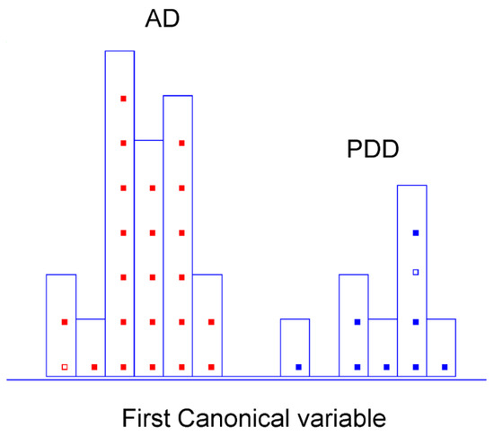 Histogram of canonical variable for the discrimination of PD-related dementia (■) and Alzheimer’s dementia (■) patients after performing SELECT-LDA in the PD dementia type direct differentiation approach (y-axis indicates the maximum discrimination power between categories).