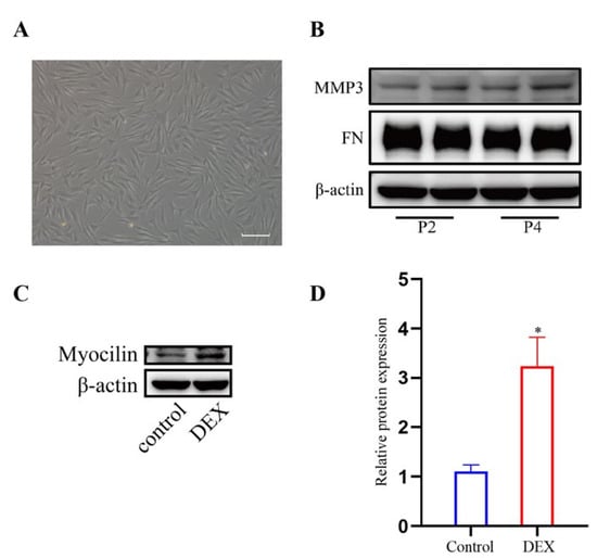 Characterization of HTM cells. (A) Phase-contrast microscopic images of HTM cells. (B) The band of MMP3 and FN in HTM cells at passage 2(P2) and passage 4(P4). (C,D) DEX treatment (1 μM for 72 h) increased myocilin expression in HTM cells, which was indicated by (C) the bands of myocilin and (D) quantification analysis of the myocilin expression level. * p < 0.05.
