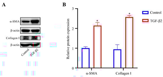 TGF-β2 treatment induced the fibrotic activity of HTM cells. (A) Serum-starved HTM cells (24 h) treated with TGF-β2 (5 ng/mL for 48 h) presented a significant increase in the levels of α-SMA and Collagen I compared with the control cells. (B) Quantification analyses of α-SMA and Collagen I expression levels. * p < 0.05.