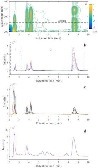 It can be seen from Figure 1b that in the measurement on the same day, no obvious peak shifts and serious time shifts were observed. At the same time, the ATLD algorithm can handle baseline shifts and tolerate slight time shifts [34]. In addition, if the time shifts affect the accuracy of the results, ATLD-MCR algorithm can be used to eliminate this effect.