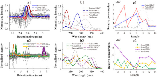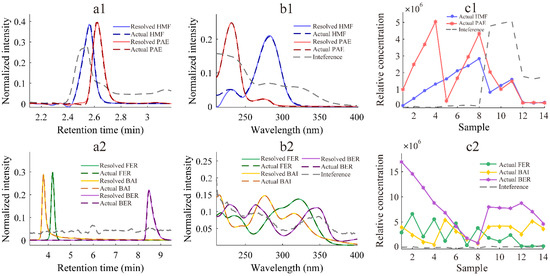 As shown in Figure 2 and Figure 3, the normalized chromatograms (a1,a2), normalized spectrograms (b1,b2), and relative concentration profiles (c1,c2) were well-resolved by ATLD and ATLD-MCR algorithms from two three-way subarrays. Even if there is interference of solvent peak, peak overlaps, and unknown components co-eluted, the target information such as pure chromatogram and spectrum of the analyte can be successfully extracted out from the information-rich HPLC-DAD data array. For ATLD and ATLD-MCR algorithms, the resolved chromatographic and spectral profiles of analytes are fairly consistent with corresponding real profiles. Especially for HMF and PAE, satisfactory qualitative results were obtained under similar retention times and interference from solvent peaks.