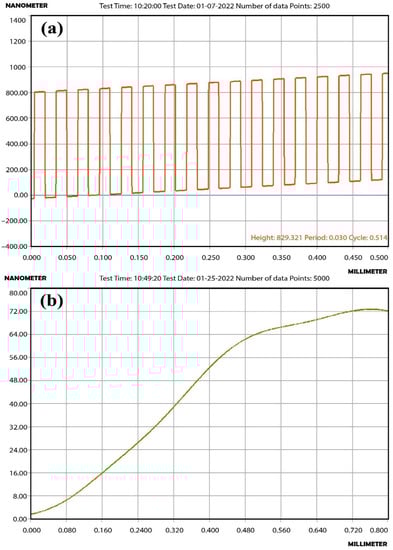 The thickness of the interdigitated electrode of the Multi-Sensor-Platform was measured by the Alpha-Step D-300 (KLA Tencor, Milpitas, CA, USA) profiler. The measured result of the electrode-substrate transition profiles is shown in Figure 5a. The thickness of the electrodes varies in the range of 800–900 nm, and the width of the gaps between the electrodes is about 15 microns.