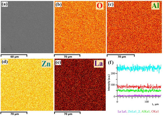 Elemental mapping analysis of the ZnO<La> film was carried out by EDX spectroscopy. The SEM image, the corresponding results of elemental mapping analysis of the ZnO<La> film, and the X-ray intensity of characteristic lines of different elements are presented in Figure 8. It is obvious that the distribution of elements Zn, Al, O, and La is even, differed from each other by colors in the mapping.