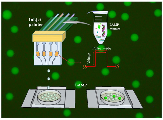 Schematic illustration of the self-assembled inkjet printer for droplet digital loop-mediated isothermal amplification. (Not real scale).