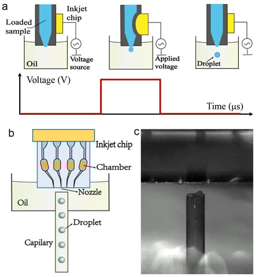 The inkjet printer is a reusable device that can be easily assembled for droplet generation. Briefly, the inkjet chip needs to be immersed in mineral oil. Adjust the position and distance between the nozzle and capillary using a high-speed microscope. By manually adjusting the X-Y stage, the nozzle on the inkjet chip would be moved to the top of the capillary, and then control the piezoelectric ceramic on the inkjet chip through a waveform generator, as shown in Figure 2a. Because the piezoelectric ceramic is tightly attached to the chamber of the inkjet chip, by adjusting the driving voltage and pulse width applied on the piezoelectric ceramic, discrete droplets can be printed. The resulting droplets fell directly and were introduced into the capillary, before finally being collected in the microfluidic chip, as shown in Figure 2b. The printed droplet size mainly depends on the driving voltage and pulse width; thus, the droplet size can be fine-tuned by changing these two parameters, which is different from the traditional microfluidic method.