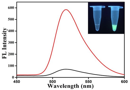To examine the LAMP feasibility, extracted HPV16 DNA was utilized as the positive sample and nuclease-free H2O as the negative control. The LAMP feasibility assay was carried out in a centrifuge tube to simplify the testing process and facilitate the results identification. The red line and black line represent the fluorescence spectra of the positive sample and the negative control after the LAMP reaction, respectively. For a positive reaction, the color change could be characterized with the aid of an ultraviolet light at 365 nm. As depicted in Figure 3, it can be clearly observed that the fluorescence intensity appeared to be increasing when the extracted DNA was used as the template but not with the negative control (nuclease-free H2O), indicating that the LAMP reaction was successful and feasible for HPV16 detection.