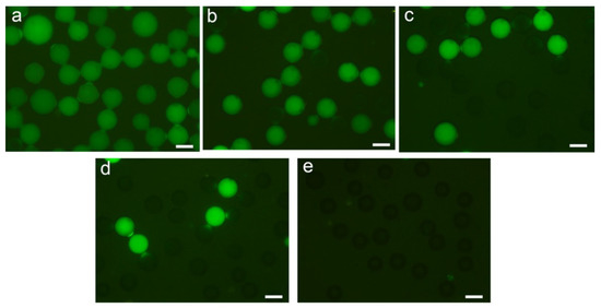 Following the isothermal LAMP reaction, representative fluorescent images were obtained by microscope, as shown in Figure 4. A droplet within the target HPV16 generates fluorescence after amplification, that is, a positive droplet, while droplets without target HPV16 have no fluorescent signal. It can be seen that the fraction of the positive droplets increased proportionally with the concentration of DNA. The increasing fraction of the positive droplets occurs due to a rise in the number of target molecules in the original sample, and consequently, the probability of a droplet containing at least one target molecule also increases, which in turn leads to an increase in the number of fluorescence droplets after the LAMP endpoint reaction.