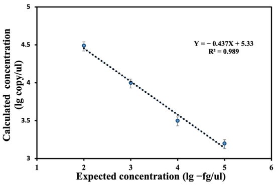 In the present study, the proposed inkjet printer method was employed to measure the concentration of target HPV16. After the Poisson statistical analysis, it was found that the calculated concentration of the HPV16 showed a good linear correlation with the expected concentration (R2 value was 0.989), as shown in Figure 5. A good correlation of the calculated and expected concentration of the HPV16 demonstrated the capability of the inkjet printer for the droplet digital LAMP.