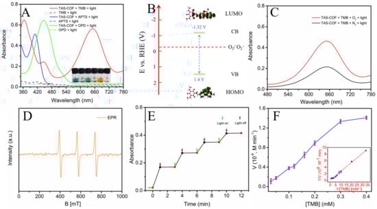 To evaluate the oxidase-like activity of TAS-COF, three typical chromogenic substrates TMB, APTS, or OPD prepared in HAc-NaAc buffer (0.2 mol L−1) were mixed with TAS-COF (0.2 mg mL−1) and exposed to the irradiation from a white-light LED lamp. As shown in Figure 2A, after 10 min irradiation, obvious color changes (blue for TMB, green for APTS, yellow for OPD) were observed for the substrates, and the absorption maxima were 650 nm, 410 nm, and 445 nm, respectively, corresponding to the characteristic absorption of oxTMB, oxAPTS, and oxOPD, respectively. These suggest the excellent oxidase-like activity of TAS-COF under visible light irradiation, and the ability of TAS-COF to catalyze the oxidation of the above colorless substrates under visible light stimulation. Figure 2B depicts the band alignment of TAS-COF. The DFT calculation results indicate that the LUMO position of TAS-COF (−1.32 V vs. Ag/AgCl) was lower than the oxygen’s reduction potential (−0.33 V vs. Ag/AgCl), indicating that the electrons in the LUMO of TAS-COF could theoretically reduce O2 to generate O2·− []. Meanwhile, the absence of oxygen (N2-saturated experiment) caused a significant absorbance signal decrease in oxTMB (Figure 2C), suggesting oxygen dissolved in the water played an important role in the process of oxidation []. In order to prove this presumption, electron paramagnetic resonance (EPR) spectroscopy was conducted with 5,5-dimethyl-1-pyrroline-noxide (DMPO) as the O2·− radical trapping agent. As depicted in Figure 2D, TAS-COF exhibited a significantly O2·− signal under the while-light LED lamp irradiation. Meanwhile, the oxidase-like activity of TAS-COF to TMB presented a staircase-like behavior with the successive “on-off” of light irradiation, demonstrating its light-triggered catalytic activity (Figure 2E).