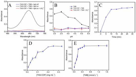 UV-vis spectra of TAS-COF + TMB system with/without the presence of UO22+ (A). The effect of pH on the absorbance at 650 nm of TMB, TAS-COF + TMB, TAS-COF + TMB + UO22+ under visible light irradiation (B). The effect of irradiation time (C), TAS-COF concentration (D), and TMB concentration (E) on the absorbance at 650 nm of the sensing system.