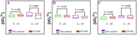 Floating bars plot of UO22+ contents of different samples by colorimetric assay. (A) T-1# and L-1#. (B) T-2# and L-2#. (C) T-3# and L-3#. (Student’s t-test by GraphPad Prism 9, p > 0.05, no significant difference).