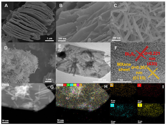The morphologies and microstructures of as-prepared samples (multilayer Ti3C2TX, Ti3C2TX nanosheet, Bi2S3 and Bi2S3/Ti3C2TX MXene) were observed using scanning electron microscopy (SEM, Hitachi, SU8010, Japan) and transmission electron microscope (TEM, FEI, Talos F200X, USA). As shown in Figure 1A, we could clearly see the organ-like structure of Ti3C2TX MXene after HF corrosion, and the thickness of each layer was about tens of nanometers. Figure 1B displayed the Ti3C2TX nanosheets after intercalation and ultrasonic exfoliation. The Bi2S3 exhibited the morphology of nanorods as seen in Figure 1C, the average diameter of nanorod was approximately 50 nm and average of length was about 450 nm. The stacking of these nanorods facilitated accurate light absorption, and these small degrees facilitated carrier transport. As observed in Figure 1D, the Bi2S3/Ti3C2TX MXene showed a stacking shape, which was made up of Bi2S3 nanorods stacked on nanosheet layers with the large specific surface area. The Bi2S3/Ti3C2TX MXene composite was further proved using TEM. The TEM images (Figure 1E) showed that the high-level Bi2S3 nanorods were coated on the low-level Ti3C2TX MXene nanosheet, which was consistent with the SEM images. The high-resolution TEM (HRTEM) image (Figure 1F) showed the interplanar spacing between adjacent lattice fringes were 0.221 and 0.267 nm, respectively, corresponding to the crystal plane of the Bi2S3 (430) and the crystal plane of Ti3C2TX MXene (010) [34,38]. In addition, the energy dispersive X-ray spectroscopic (EDS) mapping images (Figure 1G–I) revealed the homogeneous distributions of Bi, Ti, C, and S elements, indicating the successful combination of Bi2S3 and Ti3C2TX.