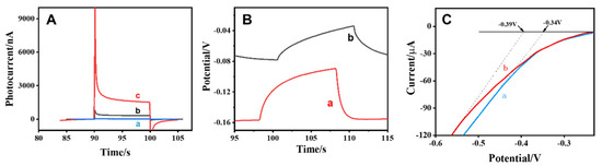 The PEC properties of different photoactive materials were investigated by recording the photocurrent response under xenon lamp light irradiation. As shown in Figure 3A, the photocurrent response of Ti3C2TX (curve ‘a’) was 23 nA. The Bi2S3 material (curve ‘b’) had a small photocurrent signal (319 nA) due to the narrow bandgap. It could be clearly seen that the photocurrent of the Bi2S3/Ti3C2TX MXene composite material (curve ‘c’) enhanced by a large margin and had better photoelectric properties. These results indicated that the internal electric field of Bi2S3/Ti3C2TX MXene had a positive effect on the separation and transfer of electron hole pairs [34,45].
