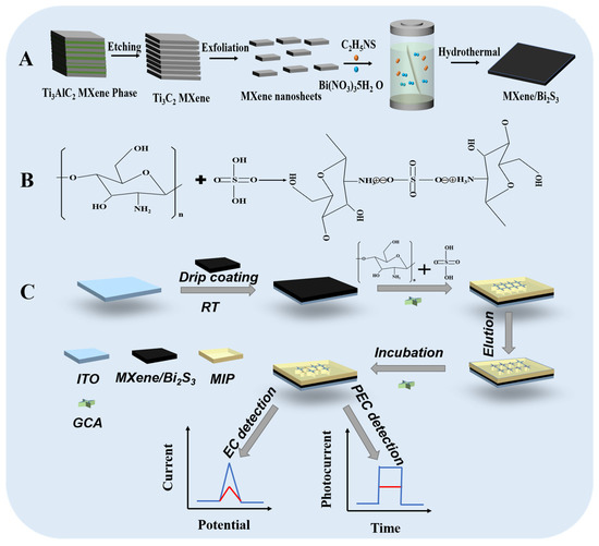 Schematic illustration of (A) the formation process of the Bi2S3/Ti3C2TX MXene; (B) the mechanism of chitosan cross-linking; (C) the principle of MIP functionalized Bi2S3/Ti3C2TX MXene nanocomposites for PEC/EC dual-mode sensing of CGA.