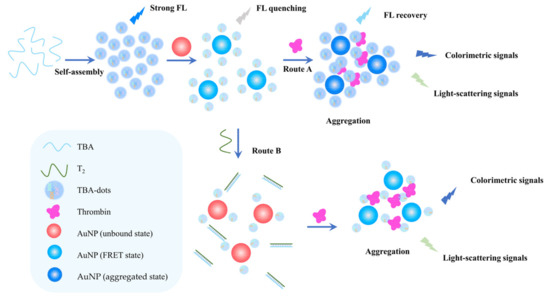 In addition to G-quadruplex/hemin composite, a series of colorimetric thrombin aptamer biosensors have been constructed by combining with nanozymes that mimic oxidase, peroxidase or superoxide oxidase [73]. The structure of cationic polymers, such as poly [3-(3′-N, N, N-triethylamino-1′-propyloxy)-4-methyl-2, 5-thiophene hydrochloride] (PMNT), is very susceptible to interference from negative ions in solution. PMNT has a peroxidase-like catalytic activity that is capable of accelerating the color changing of TMB. As one of the cationic polythiophene derivatives, PMNT exhibits differentiated catalysis capabilities in the presence of discrepant structures of thrombin aptamer. Based on this phenomenon, Liu et al., presented an ultrasensitive colorimetric sensing platform of thrombin taking advantage of cationic polythiophene derivative as a tool [74]. The TBA1 played an auxiliary role in the TMB-H2O2 reaction raising the absorbance peak, and this effect was weakened by thrombin binding to TBA1. The obtained results showed that the displayed platform was doing pretty well in thrombin sensing and offered a new perspective strategy for the determination of clinical biomolecules. Zafar et al., constructed a solid-phase colorimetric thrombin sensor based on color changes of AuNPs caused by binding between thrombin and TBA that are modified on the surface of AuNP [75]. TBA-dots are kinds of nanoparticles formed by aggregation of thrombin aptamer, which retain the recognition ability to thrombin originating from the structure of aptamer while obtaining optical properties similar to that of carbon quantum dots. It was first reported by Kuang et al., and composed with AuNPs to construct a versatile sensor for the detection of thrombin that had three different signal reading modes including colorimetric, fluorometric and light-scattering signals (Figure 4) [76]. In addition to part of TBA-dots being covalently linked to AuNPs through Au-N bonds, there were abundant TBA-dots adsorbed on the surface of AuNPs forming a shell whose charge accumulation effectively dispersed AuNPs. Meanwhile, the fluorescence intensity of TBA-dots was impaired because of fluorescence resonance energy transfer (FRET) with AuNPs. On the one hand (route A), since thrombin had multiple binding sites for the aptamers, TBA-dots/AuNPs were linked together then inducing AuNPs aggregation followed by the maximum absorption peak with redshift. In this issue, the FRET efficiency was weakened and then the fluorescence of TBA-dots recovered. Consequently, thrombin could be detected by the extent of fluorescence intensity recovery of TBA-dots and colorimetric and light-scattering signals caused by the aggregation of AuNPs. On the other hand (route B), T2 was fully complementary to TBA and hybridized with it, which brought about the destruction of the TBA-dots shell on the periphery of AuNPs and thus these AuNPs were decentralized. Under the circumstances, thrombin played the role of the bond linking TBA-dots/AuNPs closely and leading increscent AuNPs aggregation degree. Therefore, thrombin could be detected by colorimetric signal and light scattering signal simultaneously according to different aggregation extent of AuNPs.