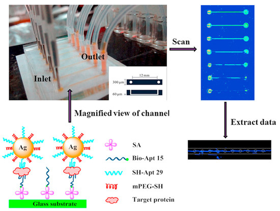 Due to the advantages of small physical dimensions, reduced sample demand and high integration, condensing the detection system on a microfluidic chip has evoked increasing research enthusiasm in biological and chemical analysis fields. In the last few years, researchers have built numerous microfluidic chip systems to detect proteins [77,78]. Zhao et al., designed an aptamer-based microfluidic chip modified by Ag nanoparticles (AgNPs) realizing colorimetric thrombin detecting [79]. The microfluidic chip system consisted of several parallel sample detection channels, and their glass substrates were modified with streptavidin (SA) to immobilize the biotinylated TBA1 by the affinity between biotin and streptavidin for thrombin capture (Figure 5). The samples were mixed with the TBA2 functionalized AgNPs and then injected into the microfluidic channels. If there was thrombin in the sample, it would be captured to form a sandwich structure composed of TBA1, thrombin and TBA2 functionalized AgNPs. The color variation due to the capture of yellow AgNPs was in line with the concentration of thrombin in the sample. Thrombin concentration could be read out approximately according to the color difference and quantitative analysis could be realized by the grayscale value measured by a flatbed scanner.