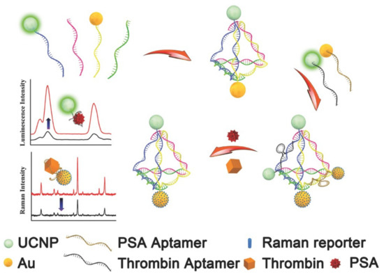 DNA pyramids are a class of three-dimensional DNA nanostructures formed by the hybridization of multiple single strands. They have the programmable size and multiple modification sites, so they receive extensive attention and have been widely used in the study of cell interaction and sensing fields. In order to detect different targets with different signaling modes simultaneously, Hao et al., designed a multifunction aptamer sensor by modifying AuNP and UCNP (upconversion nanoparticle) at the DNA pyramid vertexes [83]. As shown in Figure 7, first, the pyramid framework consisted of two unmodified oligonucleotide chains and two complementary chains separately modified with AuNP and UCNP. Then the thrombin aptamer modified with AuNP and prostate-specific antigen (PSA) aptamer modified with UCNP were combined with the frame and then the intact pyramid structure was successfully spliced. When the aptamer modified with nanoparticle encountered its target (thrombin or PSA), the specific recognition process between aptamers and corresponding targets and the competitions of aptamers with the collapse of the pyramid occurred. When thrombin was present in the detection system, the AuNP modified on TBA1 left the another causing a weakened SERS signal that was transduced by 4-mercaptophenylacetic acid as the Raman reporter. When PSA identified its aptamer, the quenched fluorescence of UCNP would be restored by leaving the pyramid. This DNA structure based on aptamers and nanoparticles assembly has imponderable potential for precise differentiation of disease markers in specific clinical applications.