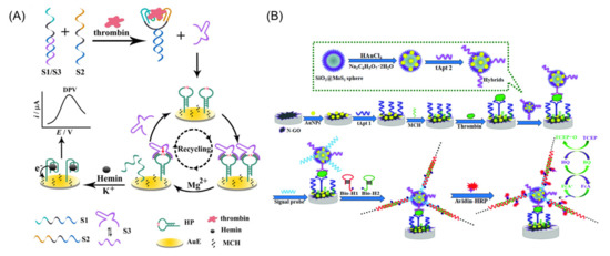 Yang et al., ingeniously cascaded strand displacement and DNAzyme signal amplification to build an electrochemical sensor for thrombin detection that was label-free without the need for enzymes [92]. There were four oligonucleotides (S1, S2, S3, and a hairpin-structured substrate sequence named HP) involved in this detecting system shown in Figure 8A. TBA1 and TBA2 were contained in S1 and S2, respectively, and were designed to recognize the thrombin target in different exosites, respectively. Initially, the DNAzyme sequence (S3) was hybridized to S1 to form a stabilized S1/S3 dsDNA. The G-quadruplex forming sequence inserted within the thiol-functionalized HP that was assembled on Au electron through the Au−S bond was segmentally blocked in the stem region to prohibit the HP from forming the stable G-quadruplex structure. S3 possessed a similar sequence as S2 that complemented S1. Therefore, if there was no thrombin, the presence of S2 would not interfere with hybridization of S3 with S1. However, if there was thrombin in the system, the two aptamers could bind thrombin at the same time enriching S1/S3 and S2 in the solution, which accelerated the proximity-dependent strand displacement reaction by shortening the distance between S3 and S2. Whereafter, the released DNAzyme cleaved the substrate sequence in HP to unlock the G-quadruplex forming sequence with the assistance of Mg2+. In the stabilization of K+, the G-quadruplex forming sequences transformed into antiparallel G-quadruplex and bound hemins to produce a megascopic current signal during the potential scan process which realized extremely sensitive thrombin sensing.