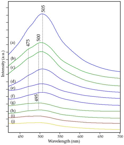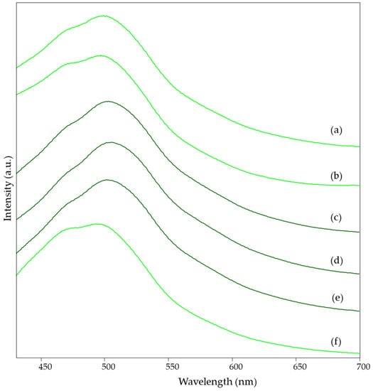 Figure 2 shows how the presence or absence of vinegar in the formulation used for egg tempera causes a different trend in the observed emission spectrum, even for the same pigment and regardless of the degree of aging. In particular, in the mock-up samples of lead white tempera prepared according to recipes involving the use of vinegar (Figure 2a,b,f), an emission maximum is observed at about 496 nm accompanied by an evident shoulder at about 473 nm, while in the absence of this component, the maximum shifts to about 500 nm and the shoulder becomes less pronounced (Figure 2c–e). Therefore, in the second case, it can be said that the overall pattern of the fluorescence band is more similar to that found for drying oils, in particular linseed oil.