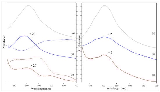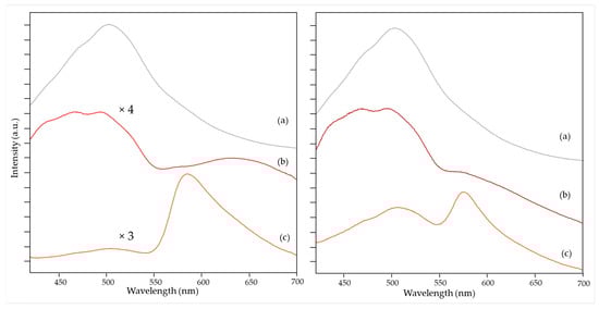 Figure 3 (left) well represents the effect associated with different pigments dispersed in a selected binder. In fact, being compounds capable of absorbing in the visible region, the coloring materials can also reabsorb part of the radiation emitted as fluorescence by the binding medium itself [11]. This self-absorption phenomenon causes an evident shift in the emission maximum or even a variation in the spectral pattern depending on the color. This effect has already been described in the literature for painting layers that have different concentrations of the colorant. Regardless, so far, a correction procedure has been carried out only in a limited number of cases [22,23]. Hence, in this work, the Kubelka–Munk theory (see Section 2.4) was applied to correct emission spectra for self-absorption. The obtained results were satisfying from the point of view of the correspondence of spectral pattern and emission maximum for pictorial layers with different pigments, as shown in Figure 3, where the same spectra are displayed before (left box) and after (right box) this correction.