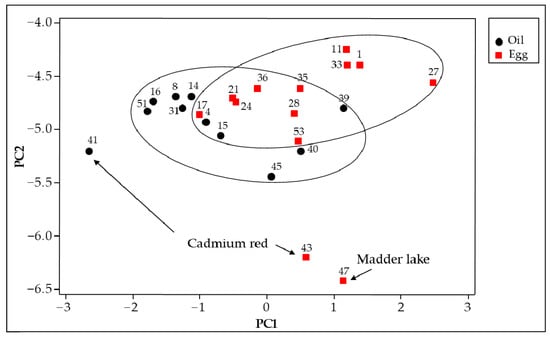 Score plot of the first two principal components of the emission spectra (λexc = 365 nm) of pictorial layers with egg tempera and oil as binders, mixed with different pigments (explained variance 89.3%). For the numbering of the samples, see Table 1.