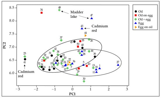 In order to investigate this aspect, PCA was applied to the emission spectra. In particular, the aim was to evaluate the possibility of distinguishing the two most used binding media in ancient paintings on wooden panels and on canvas, namely drying oil and egg tempera. Figure 5 shows that, although it is possible to identify approximately two groupings corresponding to model samples prepared with each of the two binders, there is considerable overlap between them. At least in the case of the tempera models, a possible reason for the dispersion of the corresponding points in the score plot seems to be, as already discussed in Section 3.2, the presence or absence of vinegar used as a preservative in the formulation of the binder. This component, in fact, was not added to those samples that are located in the left part of the egg group. Since the fluorescence emission of these materials is linked to alteration products of their components, it is plausible that the addition of a preservative influences the formation of these products or a part of them, thus modifying the emission spectrum. On the other hand, no significant age dependence is observed in the score plot, as expected because the spectra were normalized prior to PCA to take into account only their pattern and not the intensity of the emission bands. Finally, the spectra of the pictorial models that included fluorescent pigments such as madder lake or cadmium red obviously do not group with those of the corresponding binder.