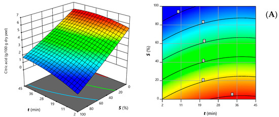 For lime peel (Equation (4)), the ethanol proportion also affected the extraction through negative linear effects (−0.98S) (Figure 2A,C); once again being the variable that most affected the extraction. As discussed above, the better solubility of citric acid in water and the higher velocity of ultrasonic waves in this solvent could support the observed extraction trends, as well as the possible structural or mechanical interactions between citric acid and pectin. On the other hand, unlike what was verified for orange peel, quadratic effects were observed when processing this citrus by-product, caused mainly by the extraction time (0.61t2) (Figure 2A,B) followed by the ethanol proportion (0.26S2). On the other hand, the ultrasonic power did not cause significant effects nor interaction coefficients between the variables in this extraction process. Overall, for both citrus by-products, low ultrasonic power and ethanol proportion were desired for the extraction of citric acid.