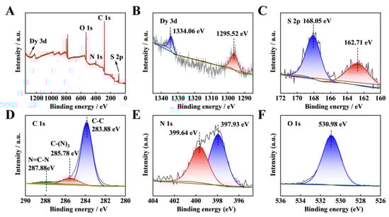(A) Total X-ray photoelectron spectroscopy (XPS) spectra of Dy-OSCN/FTO electrode; high-resolution XPS spectra of (B) Dy 3d, (C) S 2p, (D) C 1s, (E) N 1s, and (F) O 1s.